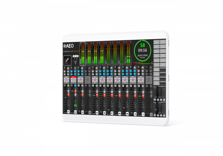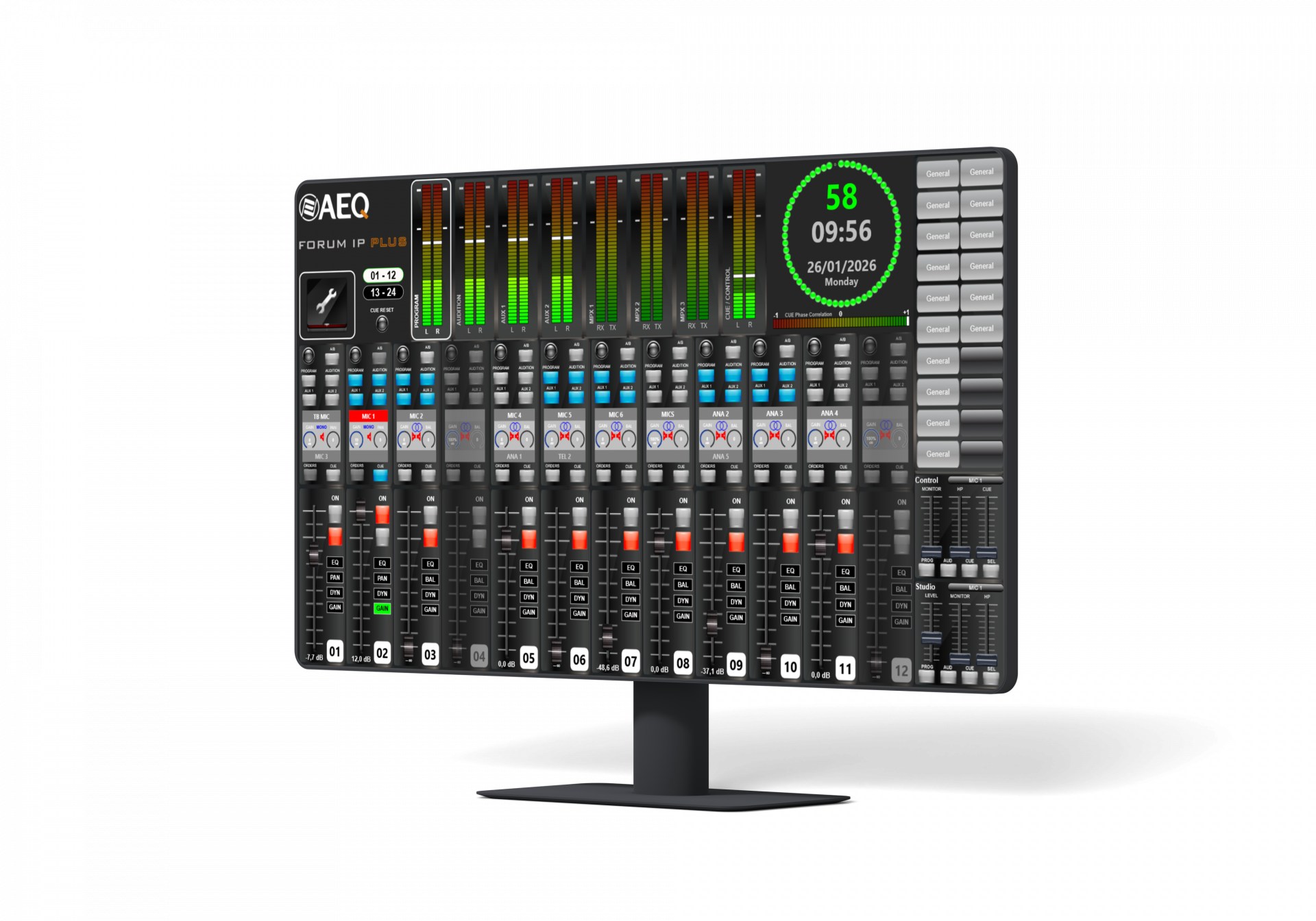 AEQ FORUM PLUS control surface is built on independent 4-fader modules, from a basic 4-channel configuration, through 8, up to a maximum of 24 channels in the IP PLUS version, and up to 12 in LITE PLUS.